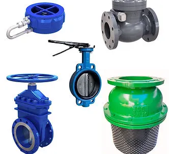 Válvulas de retenção, válvulas gaveta, válvulas borboleta e válvulas de pé.